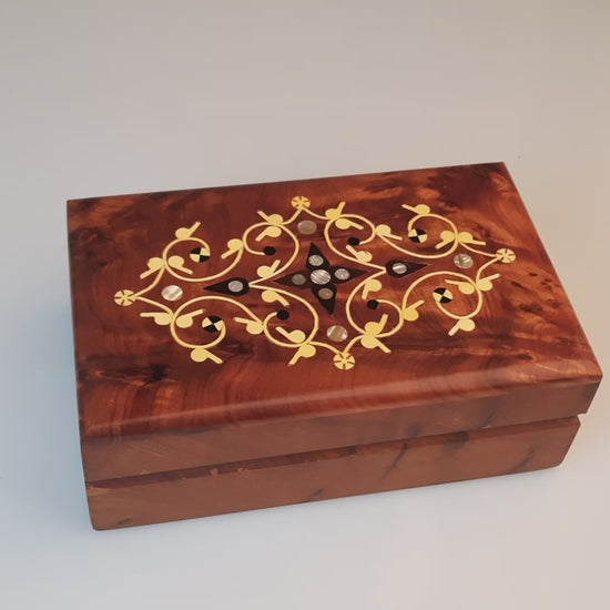 Aufgrund der natürlichen Eigenschaften des Thuyaholzes kann es zu Abweichungen in der Maserung und Farbgebung zwischen den einzelnen Schmuckkästchen kommen, was jedes Stück zu einem besonderen und einzigartigen Produkt macht. Die aufwendigen Verzierungen wurden ebenfalls von Hand gefertigt und tragen zur Einzigartigkeit des Schmuckkästchens bei.